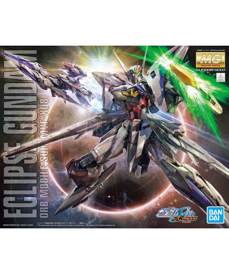 The Eclipse Gundam, featured in the manga "Mobile Suit Gundam Seed Eclipse", is now a stunning Master Grade kit from Bandai! Its proportions are kept as accurate as possible while still allowing for full posability; its various equipment is all included and can be attached via joint parts. The Saber Mode can be reproduced by attaching the beam effect to the grip parts of the rifle when separated, and clear parts for the left and right arm Beam Shields are also included. Original marking stickers are also included.