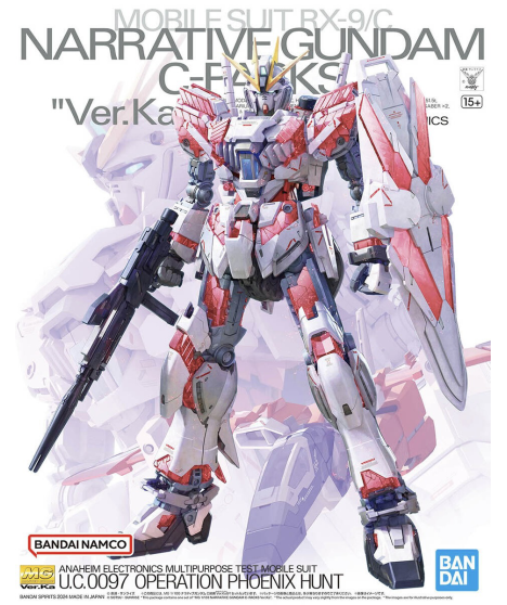 The Psycho Frame test machine Narrative Gundam C-Packs from "Mobile Suit Gundam Narrative" is the subject of this Master Grade Ver. Ka model kit from Bandai! It's equipped with a number of gimmicks created by Hajime Katoki. The thickness of the clear parts of the Psycho Frame are adjusted, with details engraved on the front, back and sides for a deep, three-dimensional shape. Depending on the angle it's viewed from, it reflects light like a crystal! A gray Psycho Frame that does not activate NT-D is included, and can be used selectively. The hip joints are movable for each block, and the fins on the back of the knees sink as the knees move, so the legs can be bent deeply without interference. It can be transformed from core block from to a bird-like core fighter by rotating the nose, and it comes with a C-equipped beam rifle that's an improved version of the Jegan rifle; you can reproduce both types with parts replacement. Two figures of Jona Bashta are included: sitting and standing.