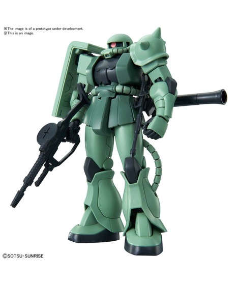From "Mobile Suit Gundam" comes an HG kit of the Zaku II! The armor around the waist has two types of materials to select from: PS molded parts or a soft material that gives you more freedom in moving the legs. Each part of the body adopts a movable gimmick to match the form of the mobile suit. And the kit includes Zaku weapons as well as its backpack.