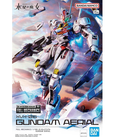 Gundam Aerial from "Mobile Suit Gundam: The Witch from Mercury" joins the 1/100 "FULL MECHANICS" model kit lineup from Bandai! Its body features a sense of layered structure, and the shell unit, which was not recreated in the HG version of this kit, is made with three-dimensional unevenness, mechanical molding, and plated parts to create an illusion of light emission! The layered structure coupled with the clear exterior gives this kit a gorgeous appearance! The legs feature slide joints, where the knee and thigh parts can be moved to follow the movement of the knee joint; the toe parts also have a split structure to reproduce natural ground contact. The shield can be divided into 11 blocks and deployed as Gambit. It can be connected to various parts of the Gundam, and if you use the Witch of Mercury Weapon Display Base (sold separately), you can display the Gundam Aerial with Gambit deployed! 09.2023 12.2023 02.2024 01.2025