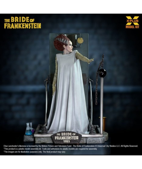 Directed by James Whale and produced by Universal Pictures, The Bride of Frankenstein is a 1935 American horror film praised for its striking visual style and memorable performances that have stood the test of time. Elsa Lanchester plays the Bride, who is best known for her spectacular hairstyle-a tall, spiky crest with long whitestreaks-created by the film's make-up artist, Jack Pierce.This time, X PLUS proudly presents a reimagining of this iconic horror figure as a 1/8 scale plastic model kit. The kitoffers two display options: her initial state, wrapped in bandages, and her revived form, showcasing her iconic hairstyle in exquisite detail. Additionally, the gown is detachable, allowing you to display her in just the bandages if preferred.To enhance the kit's appeal, we've included detailed lab tools that can be placed anywhere on the diorama, which isshaped like her bed. The bed can be displayed with or without lightning bolts, adding another layer of customization. This attention to detail and the various display possibilities makes this model kit a suitable addition for your collection. With just one kit, you can create multiple versions of the Bride, making it a hard-to-resist option for model kitenthusiasts.