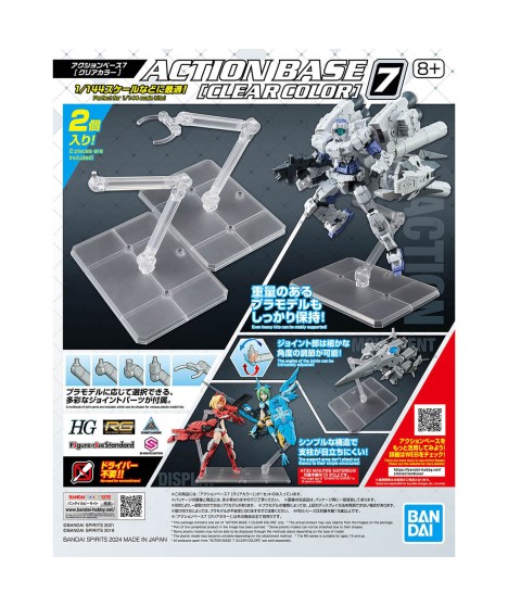 Bandai presents its seventh action base, with a simple design for ease of use! The structure allows stable holding of 1/144-scale models, and the movability of each axis supports display in a wide variety of poses! Various joint parts and arm parts are included, and can be customized; this base can hold a model of large volume with great ease. It's structured with an emphasis on strength and stable support of airborne poses. You'll get two bases. 06.2024