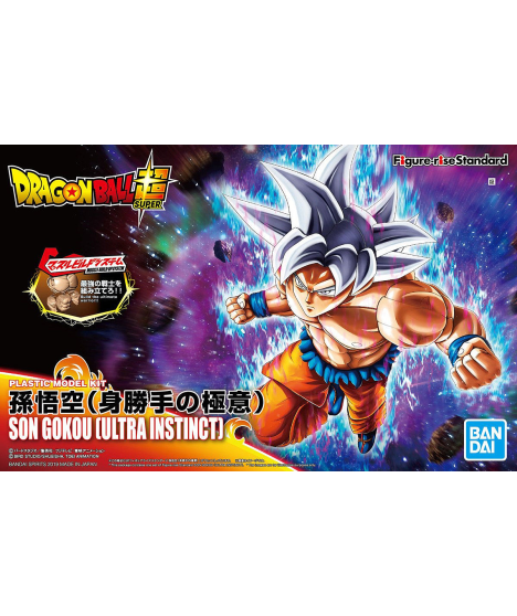 From "Dragon Ball Super" comes a Figure-rise Standard kit of Son Goku in his Ultra Instinct form! Matching his appearance from the episode "Limits Super Surpassed! Ultra Instinct Mastered!!," Goku comes without his orange shirt, and with his blue shirt torn off at his waist. His shining silver hair also appears as if it's flying up as he unleashes his power.