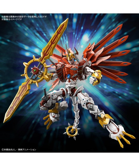 ShineGreymon from "Digimon Savers" joins the "Figure-rise Standard Amplified" model-kit series from Bandai! This light dragon type Digimon features pull-out shoulder joints to expand the range of movement, enabling him to hold the Geo Gray Sword with both hands! A movable axis in the tip of each foot enables him to stand firmly; the armor behind the knees is linked to the legs for a greater range of motion. The enormous Geo Gray Sword features jewel seals and PET seals, and in an original gimmick for this model, it can transform into a twin sword mode with parts replacement! When in twin sword mode, it can be mounted on each of ShineGreymon's legs. Each of the feathers on his wings can be individually moved, and a lead wire is built into his tail for flexibility. Hard points are placed in various areas throughout his body for expandability, too.