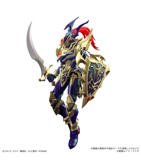 The Black Luster Soldier, the chaotic super warrior of light and darkness from "Yo-Gi-Oh! Duel Monsters," is now a member of the "Figure-rise Standard Amplified" figure-kit lineup from Bandai! It's molded in great detail for a sleek and sharp finish; polarized molding is used for the dark blue part of the armor, so the color tone changes depending on the angle of the light source! The armor and shield are made with sophisticated parts division for a precise look; the figure is fully posable after assembly, too. Interchangeable right hands are included to add expression to poses with the sword; the shield can be attached to the Soldier's back with an included joint.