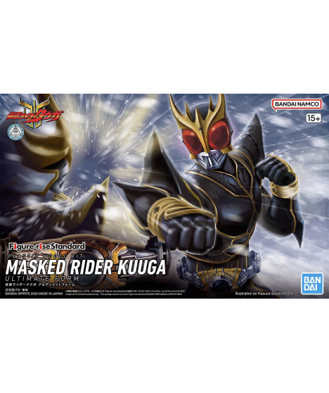 Kamen Rider Kuuga Ultimate Form joins the "Figure-rise Standard" model-kit lineup from Bandai! You'll be able to build the ultimate Kuuga with carefully selected details! Gold-plated parts are included to reproduce the golden lines on his uniform, and the gray lines are expressed by showing differences in the surface texture. The characters unique to his Ultimate Form are reproduced in the mold; this figure will have an incredibly wide range of motion after assembly, so he'll be able to get into lots of dynamic poses! Clear black compound eye parts are included, so he can be displayed as seen in the illustion depicted in "Kamen Rider Kuuga" and the Dark Eyes version seen in "Kamen Rider Decade." Fiery effect parts are included that are inspired by his supernatural ignition ability! An Action Base 6 is included, too, to support a wide range of poses.