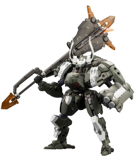 "Combat preparation complete. Start your engines. A new reinforced humanoid HEXA GEAR joins the fray in the BULKARM ? series-the successor to the hugely popular BULKARM a series. Specifically designed for close-quarters combat, the unit is nearly fully clad in new armor and wields a large melee weapon. Charge into battle with the heavily armored and armed WOLFZERKER, which also features the stylish form of a base humanoid HEXA GEAR. Model Specifications: - The large horns on the left and right of the head use 3mm connection points and can move, making them great for customizations. The visor can also open and close. - Includes four hand parts for both the left and right hands: Fists, open hands, gun-holding, and sword-holding.